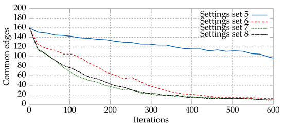 Figure 5. Total numbers of common edges between the current position of the particle, X k , and p B e s t , and between X k and g B e s t for the DPSO solving the kroA200 TSP instance (200 cities) with the parameters given by Sets 5–8 in Table 2. The remaining parameters were taken from Table 3. The values were averaged over 30 runs of the algorithm.