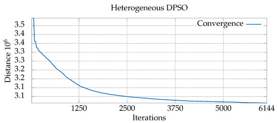 Maintaining a diversified population during the execution of the DPSO algorithm is a desired feature that may reduce the chance of getting stuck in local minima. In this section, we study the diversity of the population in the proposed self-adaptive DPSO and the original DPSO approach. In order to estimate the diversification, we used the entropy, which is measured in two ways. In the first way, the measurement concerns the edges comprising the solutions from the population (particles). Specifically, we defined a discrete probability distribution by counting edges’ occurrences in the population. For example, in the two following solutions (particles’ positions): { { 1 , 2 } , { 2 , 3 } , { 3 , 4 } , { 4 , 1 } }, and { { 1 , 2 } , { 2 , 4 } , { 4 , 3 } , { 3 , 1 } }, the edges { 1 , 2 } and { 3 , 4 } appear two times and { 2 , 3 } , { 1 , 4 } , { 2 , 4 } , and { 1 , 3 } appear once; hence, the entropy equals: H = 2 · 2 2 log 2 ( 2 2 ) + 4 · 1 2 log 2 ( 1 2 ) = 2 . The second measure of the entropy was defined analogously, but the length of the solutions was used in the place of the edges. Figure 8 shows the population entropy, which counts the number of different edges for the proposed heterogeneous DPSO and the original homogeneous DPSO. The results were obtained for 30 runs of the algorithms, which solved the gr666 TSP problem instance. As can be seen, the entropy for the homogeneous DPSO was relatively large during the first few hundred iterations, but quickly fell to much lower levels. On the contrary, the entropy in the heterogeneous DPSO dropped faster during the initial stage of the algorithm execution, but after the first 2000 iterations, it consistently remained higher than in the homogeneous DPSO. The more balanced exploration to exploitation ratio resulting from the diversity of the particles’ behaviors can explain the higher levels of the entropy for the heterogeneous DPSO.