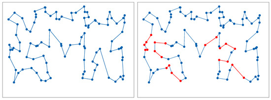 To make the comparison fair, all algorithms were solving the same DTSP instances, i.e., starting from the same static TSP and including the same DTSP-related changes to the positions of the cities. Each DTSP instance comprised 11 static TSP sub-problems, namely the original problem from TSPLIB and ten sub-problems resulting from random changes to the position of the cities. The gr666 problem was an exception, since it included only one sub-problem (the original TSPLIB problem). Figure 7 shows an example of a DTSP instance consisting of two static TSP sub-problems. The optimum solutions for each of the DTSP sub-problems were obtained using the well-known Concorde solver by Applegate et al. [41]. The number of changes in the city position between successive sub-problems was set to 3% in all DTSP cases.