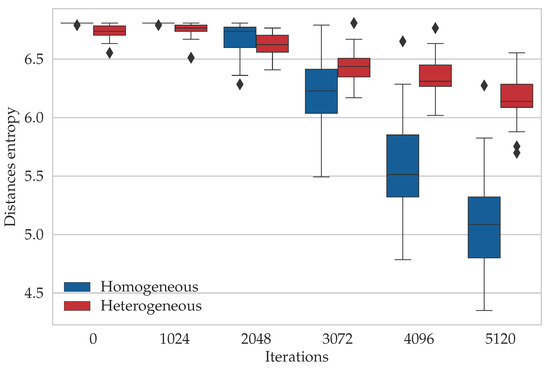 Figure 8. The comparison of the entropy of the homogeneous and the proposed heterogeneous DPSO for the gr666 TSP problem instance. The entropy was calculated based on the numbers of occurrences of the edges comprising the particles’ solutions. The plot shows the spread of the entropy levels, which were measured in 30 executions of the algorithms.