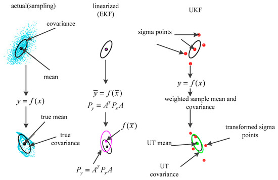 An example of mean and covariance propagation of the actual, first-order linearization of EKF and sampling method of the UKF is given in Figure 3 [9]. In Figure 3, the left parts represent the true mean and covariance propagation using the Monte Carlo sampling method; the center parts represent the propagation results using the non-linearization approach of the EKF; the right parts represent the results using the new sampling approach of the UKF. The implementation of the UKF is shown below [29]: