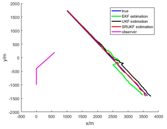 The simulation results for the bearing-only target tracking scenario are shown in Figure 4, Figure 5, Figure 6, Figure 7 and Figure 8. Figure 4 gives the scenario of true target trajectory and the estimated target trajectory. As seen in Figure 4, the SRUKF can track the target efficiently in the whole tracking period, and in the second half of the tracking period, the EKF and the UKF algorithm tend to divergent. The tracking performance of the SRUKF is superior to the EKF and UKF, and the UKF’s tracking accuracy is better than the EKF.