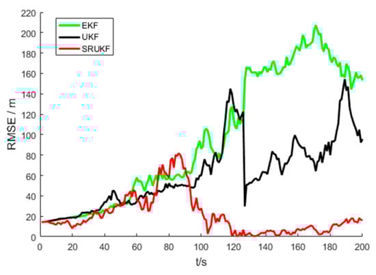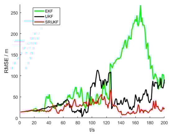 Figure 6 shows the RMSE of the target position and velocity of the UKF and the SRUKF for the bearing-only tracking scenario, in which the x RMSE and y RMSE denote the RMSE of the x axis and y axis, respectively, and the vx RMSE and xy RMSE denote the RMSE of the velocity in x axis and y axis, respectively. As shown in Figure 6, in the second half of the tracking period, the x RMSE, y RMSE, vx RMSE and vy RMSE of the UKF is larger than the SRUKF, which is consistent with the Figure 6.