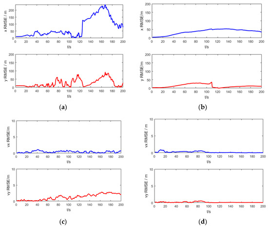The RMSE of target position and velocity for the bearing-only target tracking scenario: (a) position RMSE of the UKF; (b) position RMSE of the SRUKF, (c) velocity RMSE of the UKF; (d) velocity RMSE of the SRUKF.