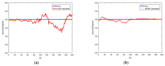 The true course and the UKF and the SRUKF estimated course for bearing-Doppler target tracking scenario: (a) true course and the UKF estimated course; (b) true course and the SRUKF estimated course.