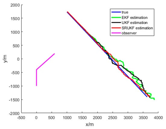 Figure 7 shows the true course, and the UKF and the SRUKF estimated course of the target for the bearing-only target tracking system. As shown in Figure 7, the SRUKF estimated course is closer to the target’s true course than the UKF. This also exhibits that the error performance of the SRUKF is superior to the UKF.