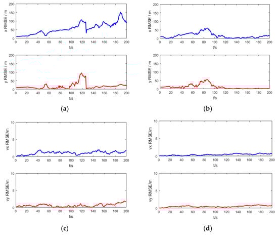 The RMSE of position and velocity for bearing-Doppler tracking scenario: (a) position RMSE of the UKF; (b) position RMSE of the SRUKF, (c) velocity RMSE of the UKF; (d) velocity RMSE of the SRUKF.