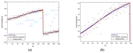 Figure 8 shows the true bearing, the SRUKF estimated bearing and measurement of bearing for the target for the bearing-only target tracking scenario. To take a close look, Figure 8b enlarges the local image of the Figure 8a. As is shown in Figure 8, the SRUKF estimated bearings are close to the true bearings.