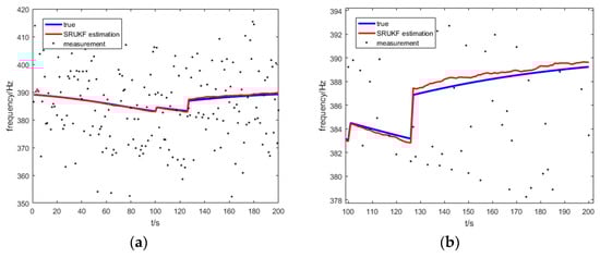 Figure 14 shows the true frequency, the SRUKF estimated frequency and measurement of frequency of the target for the bearing-Doppler target tracking scenario. Seen more clearly, Figure 14b enlarges the local image of the Figure 14a. As is shown in Figure 14, the differences between the SRUKF estimated frequencies and the true bearings is small. This is because the process noise covariance matrix often loses its positive definiteness because of the numerical instability during the tracking period. Consequently, the sigma points cannot be correctly calculated. Also, the SRUKF can overcome this disadvantage using the QR decomposition and the Cholesky factor updating.