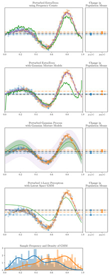 , the greater is the perturbation in the inferred function. Both the compressed and explicit kernel representation lead to very similar plots for the tree-based models, thus only the compressed kernel representation algorithm has been shown for conciseness. Note, in the case of the ExtraTrees model, each tree was individually perturbed before being combined. Further, in the case of the perceptron, a GMM was fit to the data in the inferred latent space rather than in the original input space.