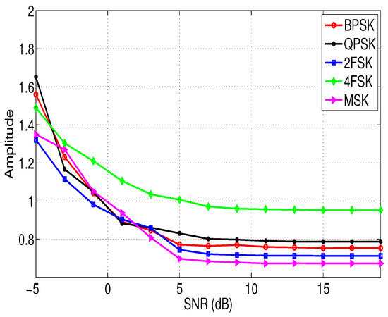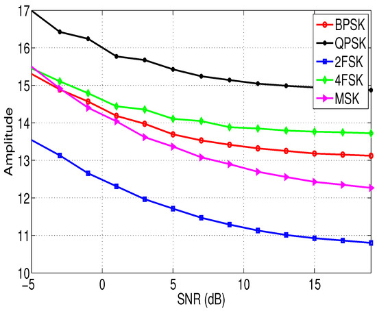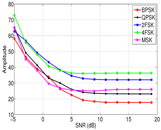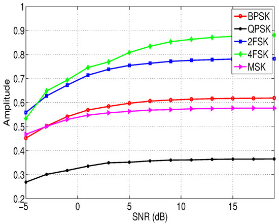 where denotes taking the maximum value, || represents taking the amplitude. The relationship between the feature of different modulation signals and the SNR is shown in Figure 4. The signal propagation channel is AWGN. It can be seen from Figure 4 that the feature of different modulation signals varies significantly, which means is a good feature to distinguish them.