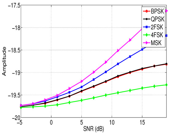 The relationship between the information entropy and of different modulation signals and the SNR is shown in Figure 5 and Figure 6. In these simulations, the sampling frequency = 10 KHz, the signal length , and without loss of generality, the order is set to 5. The noise is the white Gaussian noise. From Figure 5, it is clear that the entropy is a good feature to distinguish 2FSK, 4FSK, and MSK in a low SNR environment. Similarly, the entropy is a good feature to distinguish between BPSK and QPSK, 4FSK and 2FSK, 4FSK and MSK when the SNR is low.