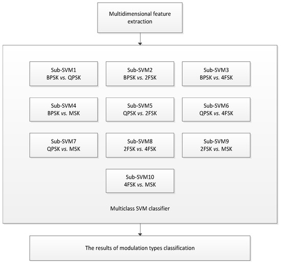 SVM was originally only used for two types of classification problems, in order to achieve multi-classification problems a multiclass SVM comprising ten two-class sub-SVMs is designed. The number of sub-SVMs is , where U is the number of the signal types. Figure 7 shows the classification procedure structure of the multiclass SVM proposed in this paper.