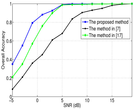To show the superiority of the method proposed in this paper, the performance of the proposed method is investigated by making comparisons with the existing methods in [7,17]. Figure 8 shows the overall accuracy of different methods under different SNRs. The test uses 1000 Monte Carlo experiments. According to Figure 8, we can obtain that when the 5 dB, the recognition performance of the method proposed in this paper is better than that of the methods in [7,17], and when the 5 dB, the recognition performance of the method proposed in this paper is comparable to that of the method in [17].