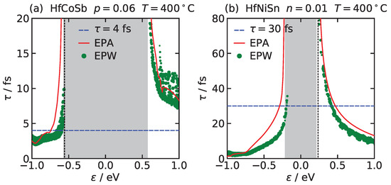 Figure 1 compares the relaxation time calculated within Equation (13) by the EPW code and within the EPA, Equation (16) for (a) HfCoSb and (b) HfNiSn. We see that the relaxation times in both approaches are in a good agreement, and furthermore that approximating the relaxation times with a constant, as done in CRTA, might fail for predicting the electron conductivity of real materials.