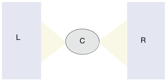 A central region (C) is connected to two external energy and particle left and right reservoirs (L and R) by metallic contacts. Current flows between the reservoirs when a temperature or bias gradient is established. The reservoirs are semi-infinite, namely the left proceeds from to C, the right goes from C to .