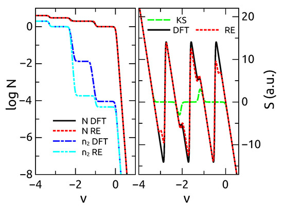 Left pane, the total number of particles N and the occupation of the second (highest) energy level as a function of the gate voltage v. While the first is exactly reproduced by both DFT and rate equations, the second differs. This originates differences also in the Seebeck’s coefficient which is sensitive to the single particle occupations (right pane). These differences are however small compared with the correction brought about by the dynamical approach. Reprinted from [73]. Copyright (2015) American Physical Society.