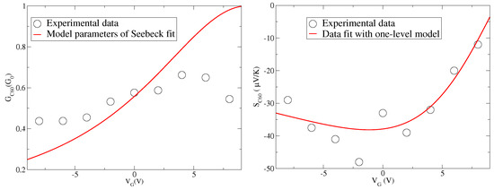 In the left panel of Figure 1, we report the experimental data of the charge conductance G as a function of the gate voltage taken again from experimental data of [17] for junctions. Even if the temperature is not high ( K), the values of G are quite smaller than the conductance quantum . Moreover, if one uses the parameters ( eV, eV, and eV/V) extracted from the Seebeck data in [17] and reproduced in the right panel of Figure 1, one finds a peak of the conductance for , hence for V. This is in contrast with the peak of G which occurs at V in the experimental data. If we try to describe the experimental data shown in the left panel of Figure 1 by using Equation (20) and the parameters extracted by fitting the Seebeck data, we get the red line reported in the left panel of Figure 1. It is evident that the agreement between theory and data is poor, and, in particular, the maximum observed for around 5 V is not recovered. We remark that eV represents the smallest energy scale apart from values of very close to the LUMO level. Therefore, the quality of the comparison cannot depend on the low temperature expansion used in Equation (20).