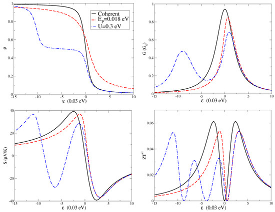 The level density is shown in the upper left panel of Figure 2, the charge conductance G in the upper right panel, the Seebeck coefficient S in the lower left panel, and the electronic thermoelectric figure of merit in the lower right panel. All quantities are plotted as a function of level energy at the temperature K. For all the quantities, we first analyze the coherent regime (black solid lines in the four panels of Figure 2), which means absence of electron–electron and electron–vibration interactions. Then, we study the effect of a finite electron–vibration coupling (red dash lines in the four panels of Figure 2) focusing on the intermediate coupling regime. Finally, we consider the combined effect of electron–vibration and electron–electron interactions for all the quantities (blue dash-dot lines in the four panels of Figure 2) analyzing the experimentally relevant regime of a large Coulomb repulsion U.