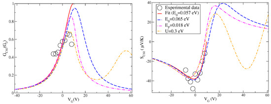 After the analysis of the effects of many-body interactions on the charge conductance and Seebeck coefficient, we can make a comparison with the experimental data available in [17] and shown in Figure 1. These data are plotted again in Figure 3 together with the fit discussed in Figure 1. We recall that for fullerene junctions the one-level model discussed in the previous section is characterized by the following parameters: eV, eV, and eV/V. We remark that the level energy used in the previous discussion is related to the energy and the gate voltage through Equation (19). Therefore, once the value of is fixed, one can switch from the energy to the gate voltage . Before introducing many-body effects, we consider a slight shift of the level position considering the case eV reported in Figure 3. This energy shift is introduced to counteract the shifts of the peaks (conductance) or zeroes (Seebeck) introduced by many-body interactions which, in addition, reduce the amplitudes of response functions. The aim of this paper is to provide an optimal description for both charge conductance G and Seebeck coefficient S.