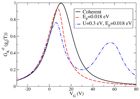 Starting from the level energy eV, in Figure 3, we analyze the effect of the electron–vibration coupling in the intermediate regime eV. The shift induced in the zero of the Seebeck coefficient is still compatible with experimental data. Moreover, the electron–vibration interaction shifts and reduces the peak of the charge conductance in an important way. However, this is still not sufficient to get an accurate description of the charge conductance. One could increase the value of the coupling energy , but, this way, the shift of the conductance peak becomes too large with a not marked reduction of the spectral weight.