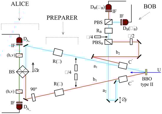 The scheme adopted in Rome exploited the approach proposed by Sandu Popescu in 1995 [46]. A total of two photons, rather than three as done in Innsbruck by Zeilinger’s group [16], were used. Let us briefly summarize the description provided in Figure 2. The two photon entangled state exhibited a path entanglement while the polarization degree of freedom of one of the photons was employed for preparing the unknown state. This approach avoided the difficulties associated with having three photons, as done in [16], and made the Bell measurement complete. This scheme is equivalent to the original scheme up to a local operation (since, in principle, any unknown state of a particle from outside could be swapped onto the polarization degree of freedom of Alice’s EPR particle by a local unitary operation as discussed below). In particular, if the preparer does not tell Alice what state he has prepared then there is no way Alice can find out what the state is. It is worthwhile mentioning that this approach leads to a 100% success rate for the Bell measurement in the ideal case rather than 50% as in three photon based schemes.