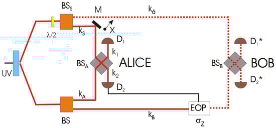The work realized in [19] reported for the first time the complete, i.e., active, qubit teleportation process by completing the corresponding optical scheme according to the full quantum teleportation protocol. This achievement was accomplished exploiting the concept of vacuum-one photon qubit introduced in the previous section. The experimental setup, Figure 4, can be somewhat considered to be the “folded” configuration of the one reported in Figure 3. The significant changes consisted of the addition of the optical delay line and of a different measurement apparatus at Bob’s site.
