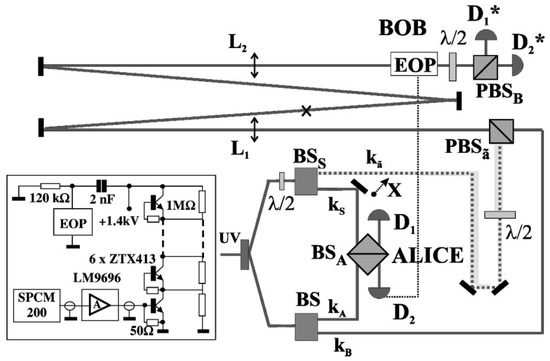 ”Active” teleportation of a quantum bit. The experimental set-up can be somewhat considered to be the ”folded” configuration of the one reported in Figure 2. The significant changes consisted of the addition of the optical delay line (DL) and of a different measurement apparatus at Bob’s site where a high-voltage micro Electro Optics Pockels cell (EOP) performs a unitary transformation . In the inset is reported the diagram of the fast electronic switch of (EOP). Picture from [19].