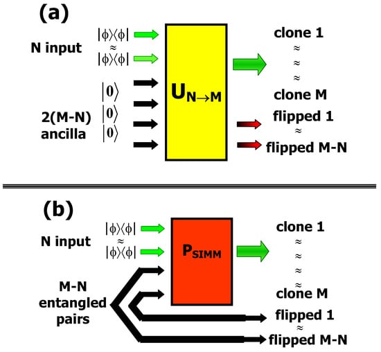 - The first one has been based on finding a suitable unitary operator , acting on N input qubits and on ancillary qubits: Figure 5a. At the output of this device we obtain M and qubits which are, respectively, the optimal clones and the best flipped qubits of the input ones. The transformation can be deterministically realized by means of a quantum network, as proposed by Buzek et al. [65].