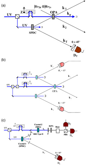 Three different configurations for the amplification of quantum states. (a) Schematic diagram of a noncollinear quantum-injected optical parametric amplifier (OPA). The injection is provided by an external spontaneous parametric downconversion source of polarization-entangled photon states. (b) Double injection of the optical parametric amplifier. (c) Collinear quantum-injected optical parametric amplifier. Picture from [69]. Spontaneous parametric down conversion (SPDC).