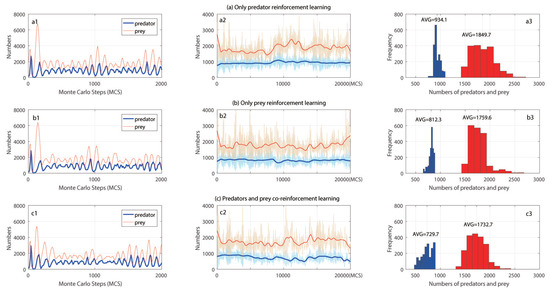 (a) The case of only predator reinforcement learning. (a1) Numbers of predators and prey evolving through time. From top to bottom, red line represented numbers of prey, blue line represented numbers of predators; (a2) The trend of predators and prey evolving through time at 0–20,000 MCS (LOWESS smoother on the numbers); (a3) The average numbers of predators and prey and the statistical results of quantitative distributions, left blue one was predators with average number 934.1, red one was prey with average number 1849.7. (b) The case that only prey reinforcement learning. (b1) Numbers of predators and prey evolving through time. From top to bottom, red line represented numbers of prey, blue line represented numbers of predators; (b2) The trend of predators and prey evolving through time at 0–20,000 MCS (LOWESS smoother on the numbers; (b3) The average numbers of predators and prey and the statistical results of quantitative distributions, left blue one was predators with average number 812.3, red one was prey with average number 1759.6. (c) Co-evolution of predators and prey. (c1) Numbers of predators and prey evolving through time. From top to bottom, red line represents numbers of prey, blue line represents numbers of predators; (c2) The trend of predators and prey evolving through time at 0–20,000 MCS (LOWESS smoother on the numbers); (c3) The average numbers of predators and prey and the statistical results of quantitative distributions, left blue one was predators with average number 729.7, red one was prey with average number 1732.7.