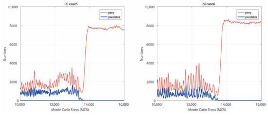 Here, we examined the inconsistent learning periods and speed of predators and prey. We considered four cases and simulated 20,000 MCS, respectively. The four inconsistent cases are shown in Table 1: case4 represented the learning of predators began when the ecosystem started to run, and prey began to learn at 500 MCS; case5 represented the learning of prey began when the ecosystem started to run, and predator began to learn at 500 MCS; case6 represented the training period for predators was 50 MCS and the training period for prey was 100 MCS; case7 represented the training period for predators was 100 MCS and the training period for prey was 50 MCS. The results of mean numbers of predators and prey on the four cases and the basic four cases in Figure 2 are shown in Table 1. Notably, case0 showed the basic line of the model where both predators and prey do not learn.