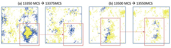 The spontaneous spatial patterns in case5 that prey began to learn before predators 500 MCS (case5 in Table 1). (a) showed the distributions on 13,350 MCS and 13,375 MCS. (b) showed the distributions on 13,500 MCS and 13,550 MCS.
