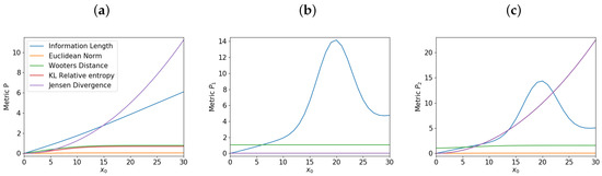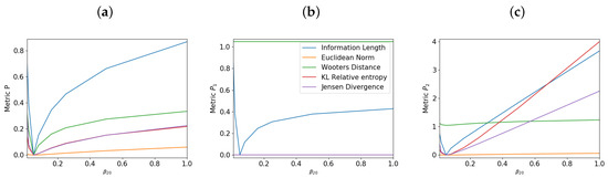 We now fix and vary the initial mean position of to examine how metrics depend on , as we have done for the single O-U process in Section 3. Figure 4 shows the total information change for each metric for different values of , for P, and in panels (a), (b), and (c) respectively. Specifically, Figure 4a shows that for P, the total information length against is linear, capturing the linearity of the system as expected from the single O-U process. None of the other metrics are capable of showing the linear relationship in the same way. On the other hand, Figure 4b,c shows an interesting non-monotonic dependence of the information length on .