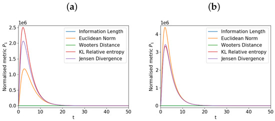 To investigate the evolution of the metrics for the around , we show in Figure 3 how the metrics evolve over time for the component for the two different values of and near the equilibrium value . Panel a) is for and panel b) is for . The different metrics are denoted by using the same color as used in Figure 2. This small deviation of from the equilibrium value induces a small change in over time due to the coupling to , as noted above. However, in panels a) and b), we see a significant change in the Euclidean norm, K-L relative entropy, and Jensen divergence in time, with a large increase before settling down to a lower value. In comparison, the information length shows no such spike. These spikes are caused by the deviation of from its initial equilibrium state due to the coupling to before settling into the equilibrium state as approaches the equilibrium. What is interesting is that the information length does not show such a spike since it measures the local information change; this would thus be the more sensible view in this instance since the change in the component is small compared to its width (uncertainly). Furthermore, such spikes do not appear for nor P (results not shown) since starting from a non-equilibrium state monotonically approaches its equilibrium.