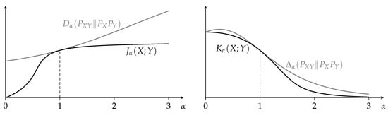 The measures and share many properties with Shannon’s mutual information [], and both are equal to the mutual information when is one. Except for some special cases, we have no closed-form expressions for or . As illustrated in Figure 1, unless is one, the minimum in the definitions of and is typically not achieved by and . (When is one, then the minimum is always achieved by and ; this follows from Proposition 8 and the fact that .)