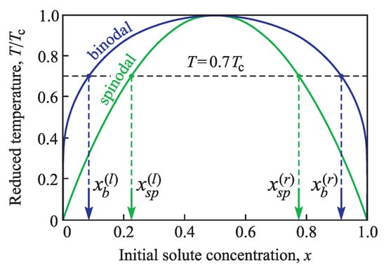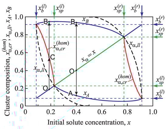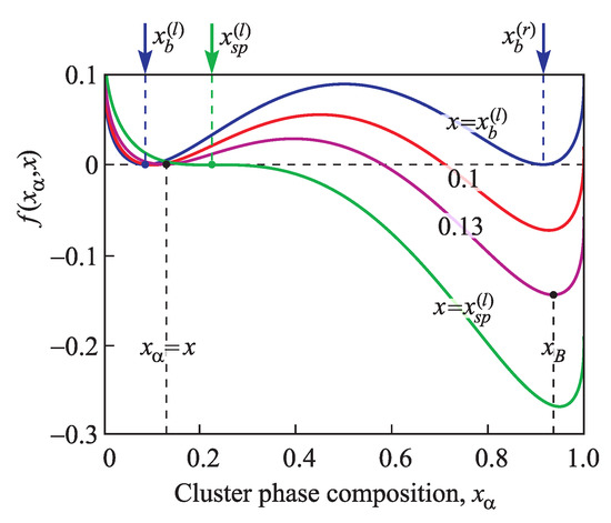 The regions of metastability are in composition ranges (between the left branches of the binodal and spinodal) and (between the right branches of the spinodal and binodal). The function has one maximum and two minima (for ). The first minimum, , corresponds to the state of the ambient phase. The second minimum, , corresponds to the final macroscopic state of the precipitating phase, to which a cluster evolves at fixed composition of the surrounding solution, x. It is determined by the minimum of the bulk contribution to the Gibbs free energy (Figure 3),