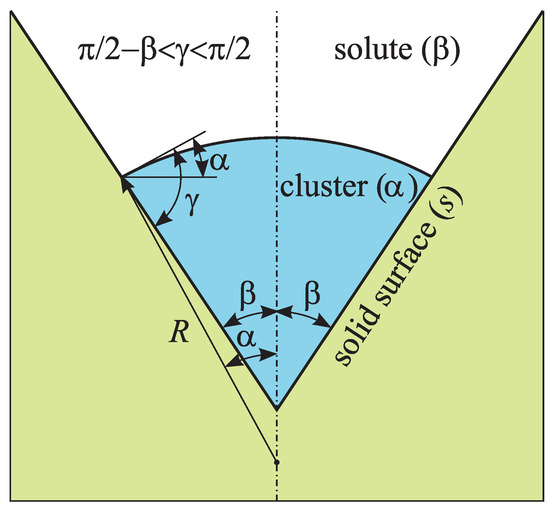 For the case when the surface tension of the cluster boundary with the pore surfaces is less than that between solutions and the same surfaces (), and the contact angle determined by Young Equation (18), as