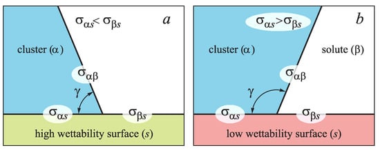 Contact angle for well (a) and badly (b) wettable surfaces. The corresponding specific interface energies are , and .