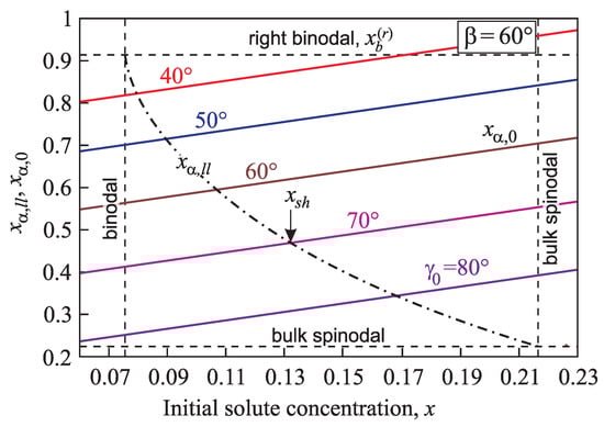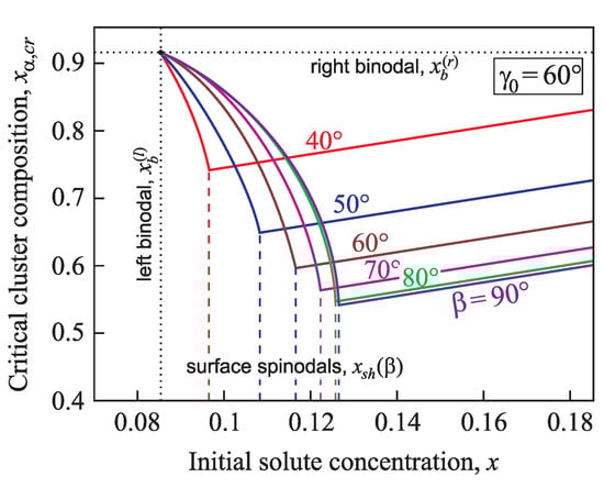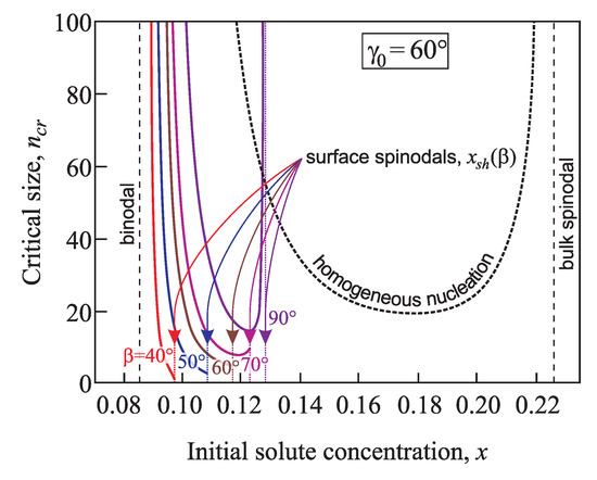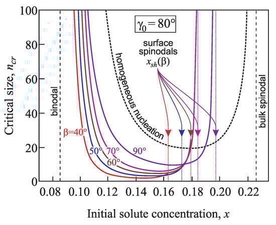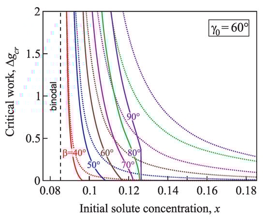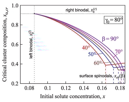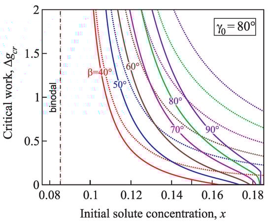 The composition of a critical cluster, , is shown in Figure 9 and Figure 10 in dependence on the initial supersaturation for the case of nucleation in a conic pore with various angles and two different values of the equilibrium contact angle (Figure 9) and (Figure 10). With an increase of the supersaturation from an initial value close to the binodal the concentration of the second component in the critical cluster, , decreases down to the minimum value at (Figure 9 and Figure 10). If the supersaturation increases further, grows linearly (see Equation (36) and Figure 6).