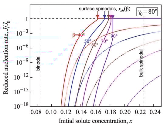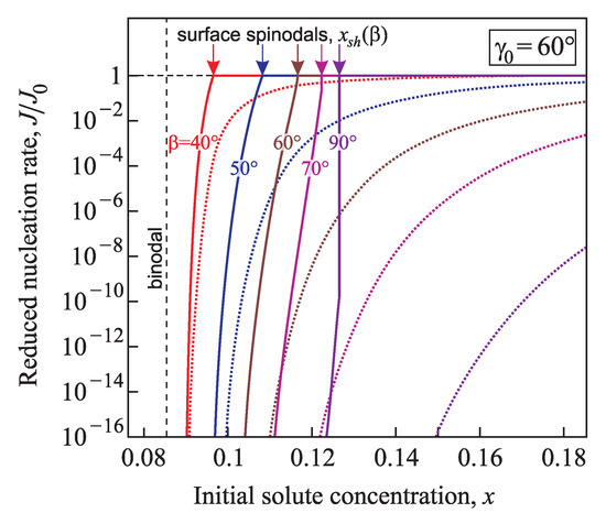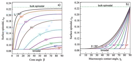 Is evident that the spinodal for heterogeneous nucleation is located nearer to the binodal as both the pore cone angle (Figure 7a) and the macroscopic contact angle (Figure 7b) yield its shift to decreasing values of x. If the equilibrium contact angle is equal to , the heterogeneous spinodal coincides with the macroscopic one, i.e., , like in the case of the homogeneous nucleation.