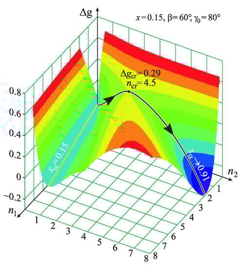 For a metastable state of the initial solution, , the work of critical cluster formation in the space has characteristic saddle points properties near to the parameters of the critical cluster, . The surface is shown in Figure 8 for the case of nucleation of a new phase cluster in a pore with an angle and for an equilibrium contact angle and at the composition of the ambient phase equal to . The “valley” at corresponds to the initial state, and the saddle point to the critical cluster. Its parameters are determined by Equations (29). In the course of its growth, the new phase cluster passes through a saddle point. Finally, its composition tends to an equilibrium value nearly equal to the respective value on the right binodal .