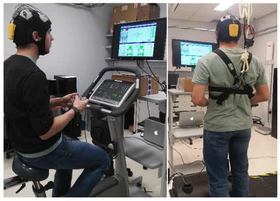 Before starting the data collection, a tutorial explaining the experimental procedure and task to be executed was shown to the participants. Next, various sensors were placed on the subject. These included a portable eight-channel wireless EEG headset (Enobio, Neuroelectrics), a portable chest strap (Bioharness 3, Zephyr) for ECG, respiration, and accelerometer signal recording, an E4 (Empatica) wrist watch which measures blood volume pulse, skin temperature, galvanic skin response and acceleration. Following this step, in the case of participants using the treadmill, a safety harness was placed on the participant’s chest to avoid falls. For participants using the stationary bike, they were asked to adjust the seat according to their preference. The height of the screen was then adjusted to provide a more comfortable set-up. Three levels of physical activity were considered: no movement, medium (treadmill: 3 km/h, bike: 50 rpm), and high (treadmill: 5 km/h, bike: 70 rpm). Figure 1 shows the experimental setup for both bike and treadmill conditions.