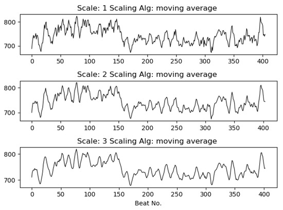 Figure 3. Scaled inter-beat interval (RR) time series with the moving average algorithm for scales (original series) to .