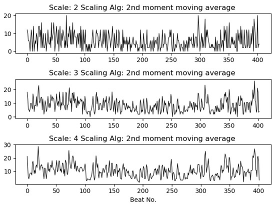 - The second moment moving average (): we propose the moving average procedure for calculation of the second moment to adapt to short time series. This replaces the non-overlapping windows used in coarse graining to a sliding window, as in the case of the moving average algorithm.Figure 3 and Figure 4 show the RR series and RR volatility series (using ) for scales to and scales to , respectively, for a five minute ECG segment. As can be seen, scaling removes some high frequency information from the series, commonly associated with artifacts.