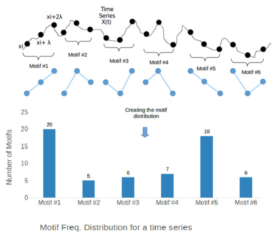 Figure 5. Original motifs of degree appearing in a time series.The modified permutation entropy () is then given by:where n is the number of additional motif patterns added for the modified permutation entropy and is the relative frequency of the motif pattern represented by and calculated as:where denotes the indicator function of set A defined as if and otherwise and denotes the map from pattern space to symbol space. - Weighted modified permutation entropy (): weighted permutation entropy was proposed to incorporate the amplitude information into the permutation entropy algorithm. This is done by calculating the variances (referred as weights ) corresponding to each motif pattern in the time series. The relative frequency of a given pattern is then calculated as:The permutation entropy for this adjusted relative frequency is then calculated using the standard permutation entropy equation in (8).