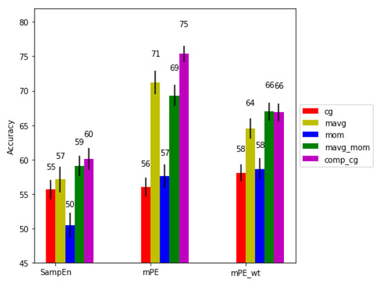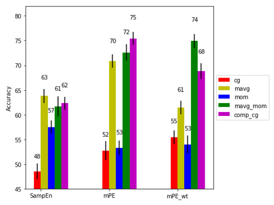 We calculated the accuracy () for different activity levels with the combinations of the three entropy measures and five scaling algorithms. Figure 6, Figure 7 and Figure 8 show the performance of the algorithms for no, medium and high physical activity levels, respectively. As can be seen, generally across all physical activity cases and for all entropy algorithms, the short time moving average based scaling ( and ) and composite based scaling () methods outperform coarse graining based approaches (, ). It can also be seen that the modified permutation entropy based on second moment based scaling methods ( and ) (referred to as generalized permutation entropy in [24]) typically achieve higher predictive power across all physical workload cases, hence indicating the importance of volatility series of the series, as well as series. Lastly, the modified permutation entropy based algorithms ( and ) performs better than sample entropy based methods.