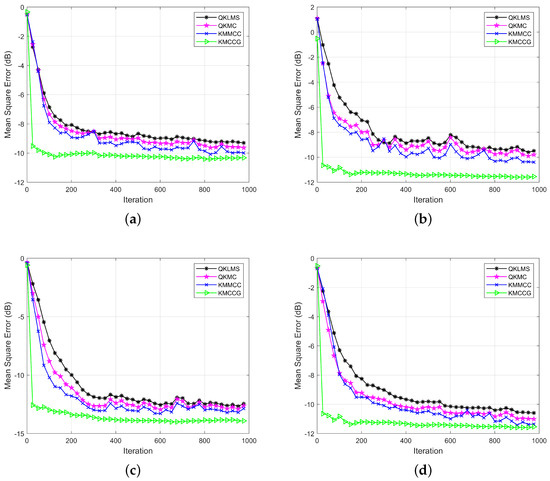 Mackey–Glass time series prediction: learning performance in terms of the testing MSE (mean square error) for QKLMS (quantized kernel least mean squares), QKMC (quantized kernel maximum correntropy), KMMCC (kernel maximum mixture correntropy), and KMCCG (kernel mixture correntropy conjugate gradient) under different noise environments: (a) Gaussian; (b) Bernoulli; (c) sine wave; (d) uniform.