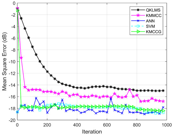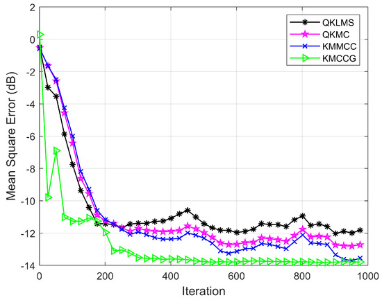 The algorithm KMCCG was compared with the quantized KLMS (QKLMS) algorithm [34], the quantized kernel maximum correntropy (QKMC) algorithm [35], and the kernel maximum mixture correntropy (KMMCC) algorithm [15] in four different noise environments, to verify the performance of our proposed algorithm. Here, QKLMS is one of the most classical KAF algorithms based on the mean square error (MSE) criterion, and it achieves good prediction accuracy in the Gaussian noise environment. QKMC is a KAF algorithm based on correntropy, which can also achieve good prediction accuracy and maintain robustness. The recently-proposed algorithm KMMCC combined with the mixture correntropy criterion has been demonstrated to be able to obtain satisfactory prediction accuracy and robustness. All algorithms were configured with a Gaussian kernel. For a fair comparison, the optimal parameter setting was conducted to let each algorithm achieve the desirable performance. Finally, the performance of the algorithm was evaluated by MSE, which is defined here as follows: