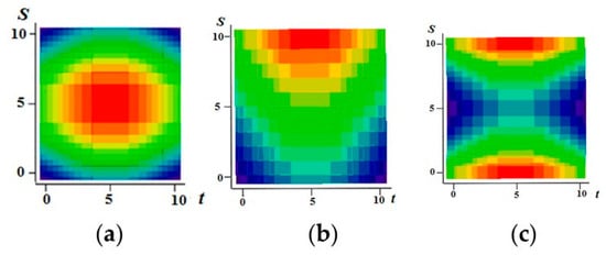 Figure 1 shows examples of realizations of fields formed by the sum Equation (1). The number of levels according to the values of each function in Figure 1a–c is 10 (a total of 19 field levels). High intensity of red color means the maximum value of the field, and high intensity of blue color minimum.